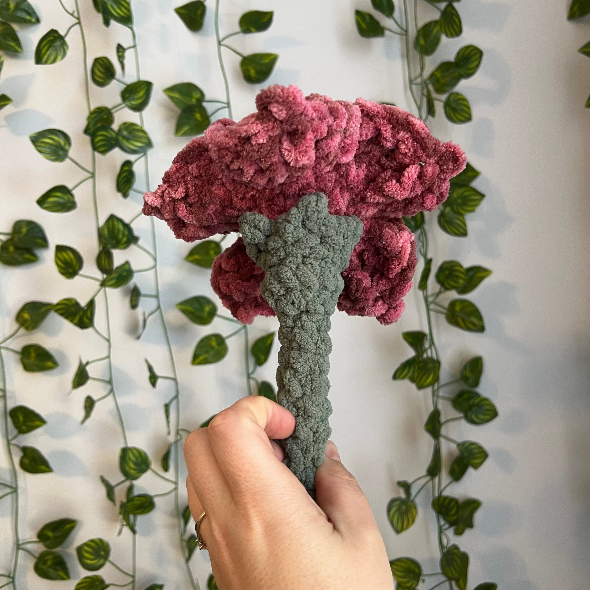 this gorgeous oversized hibiscus is made from a soft plush yarn, making it a unique addition to your decor